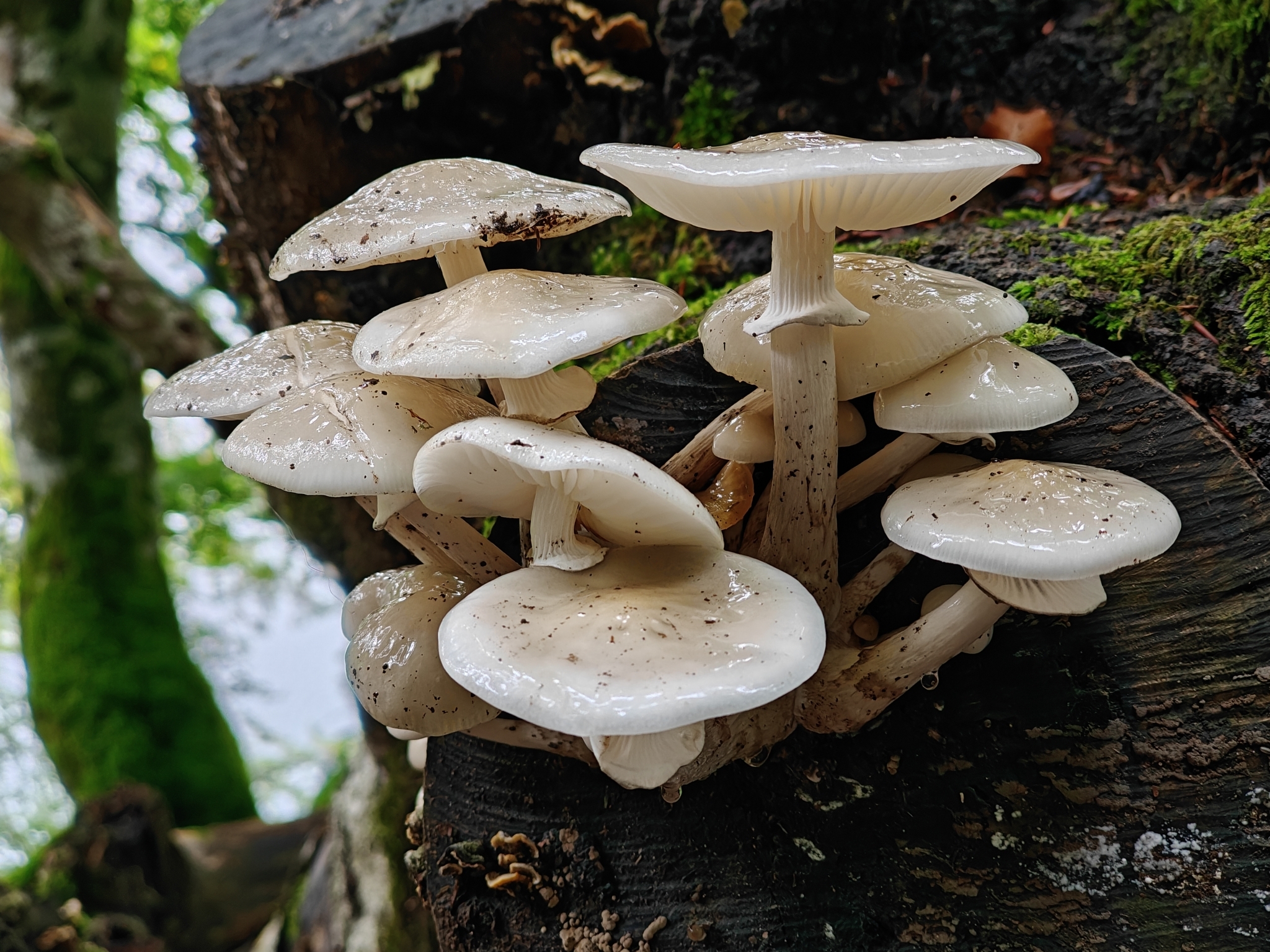 Oudemansiella mucida is one of the most elegant and ornamental wood-growing fungi in the European mycoflora. When it fruits on the lower surface of tree trunks, the stipe tends to curve, keeping the cap horizontal, with the gills facing downward.